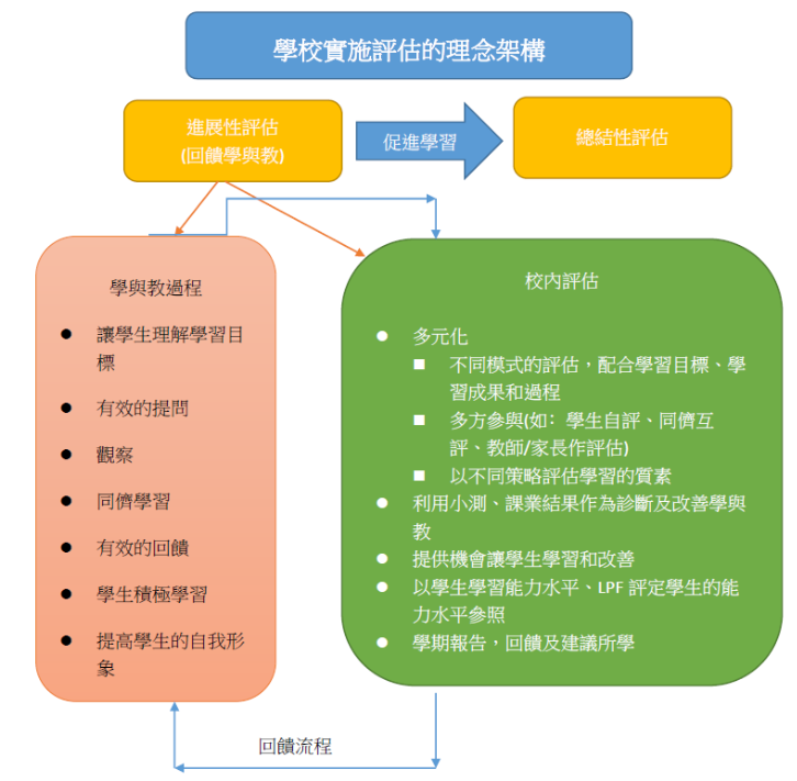 學校教、學、評互相緊扣,按不同評估目的靈活運用多元化的評估模式,利用「對學習的評估」(例如:測驗、小評估等)收集評估數據,總結學生階段性的學習成果。亦推行「促進學習的評估」(例如:進展性的學習單元評估、專題研習等),教師會透過回饋為學生在整個學習進程中提供協助和改善建議,亦會按學生學習表現調整學與教策略,促進學生有效學習。同時學校也推動以學生為主導的「作為學習的評估」(例如:自評和同儕互評等),讓學生在學習過程中學習檢視自己或同儕的學習效能,反思和調整學習策略,以發展他們自主學習的能力。