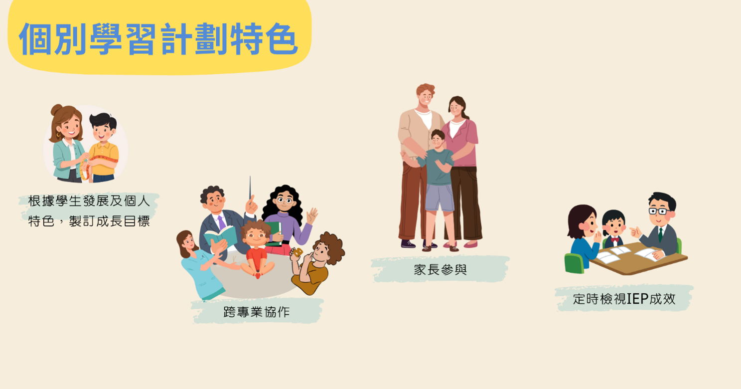 個別學習計劃 (以下簡稱為IEP) 是為本校每一位學生所擬訂之文件,以協助每一位學生在學業、社交、行為、自我照顧和其他成長需要上的發展。透過多專業的介入整合, IEP不只可加強教職員的專業協作、協調和溝通,並可引導家長介入,為學生規劃適切的教學目標並據此計劃評鑑執行的成效。每年的學期初,由階段統籌主任召開「個別學習計劃會議」開始,經過一整年的IEP計劃執行流程,至學期尾家長日與家長一起檢討學生個別學習計劃報告,並商討下學年學生個人成長目標止,才完成整年的流程。