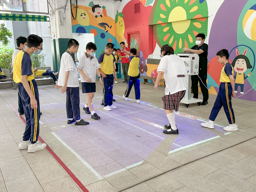 在有蓋操場中,本校設置了需要2至4人合作的遊戲,例如投地遊戲,旨在增強學生的團隊合作能力和社交技巧。另外,本校設立AI運動驛站鼓勵學生養成健康的生活習慣,並引導他們遵守輪替規則,提升社交能力。