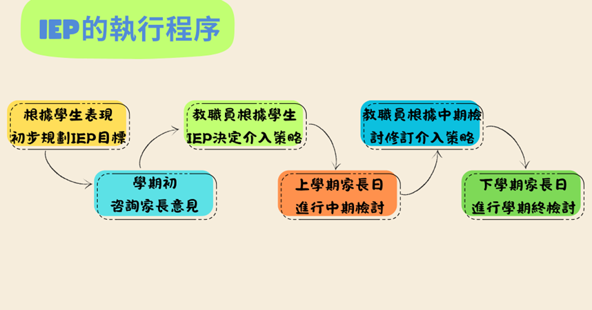 個別學習計劃 (以下簡稱為IEP) 是為本校每一位學生所擬訂之文件,以協助每一位學生在學業、社交、行為、自我照顧和其他成長需要上的發展。透過多專業的介入整合, IEP不只可加強教職員的專業協作、協調和溝通,並可引導家長介入,為學生規劃適切的教學目標並據此計劃評鑑執行的成效。每年的學期初,由階段統籌主任召開「個別學習計劃會議」開始,經過一整年的IEP計劃執行流程,至學期尾家長日與家長一起檢討學生個別學習計劃報告,並商討下學年學生個人成長目標止,才完成整年的流程。